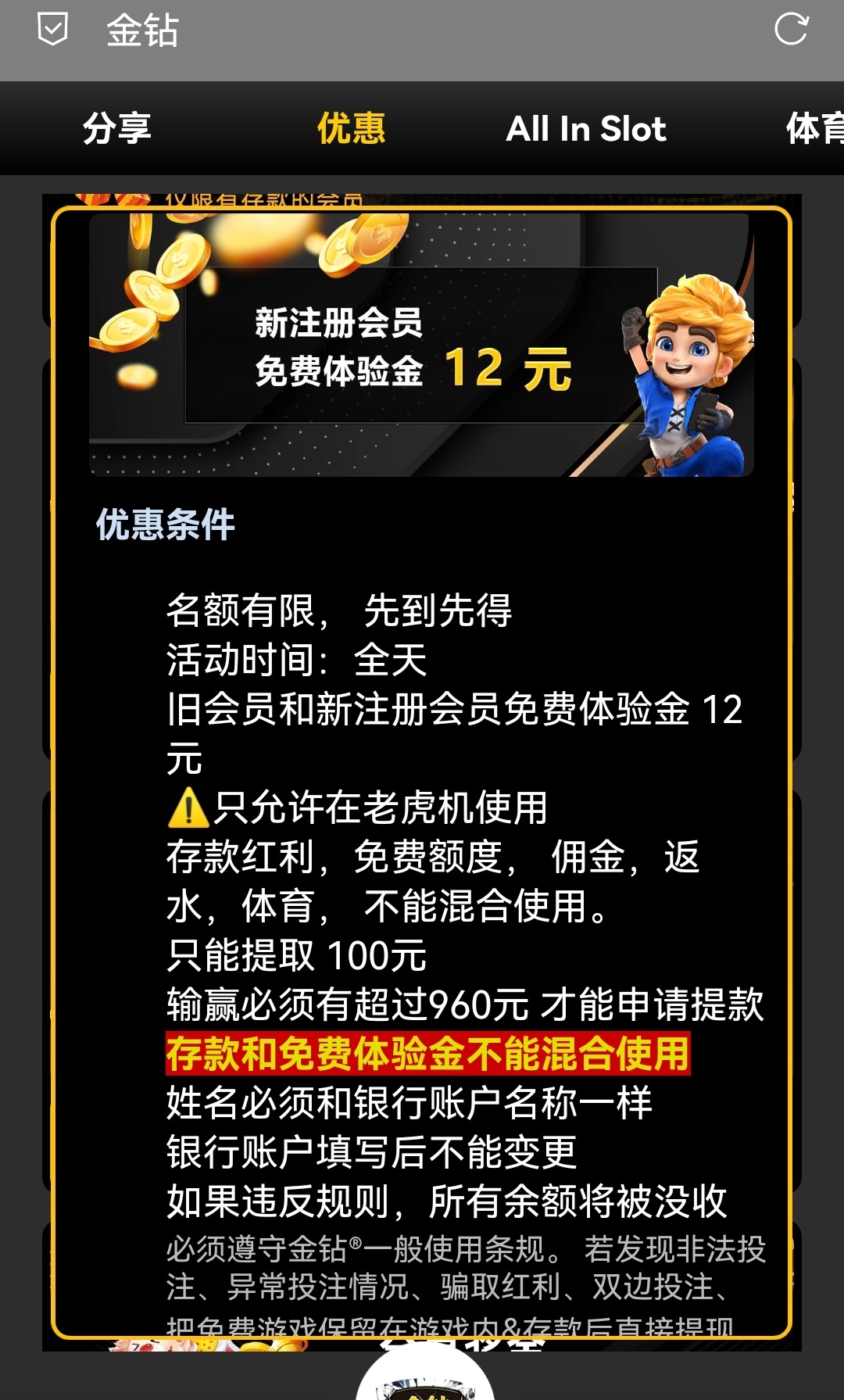 我看了一下 这个台子送的12提款是最高只能提100 说的是输赢要满960才能提100