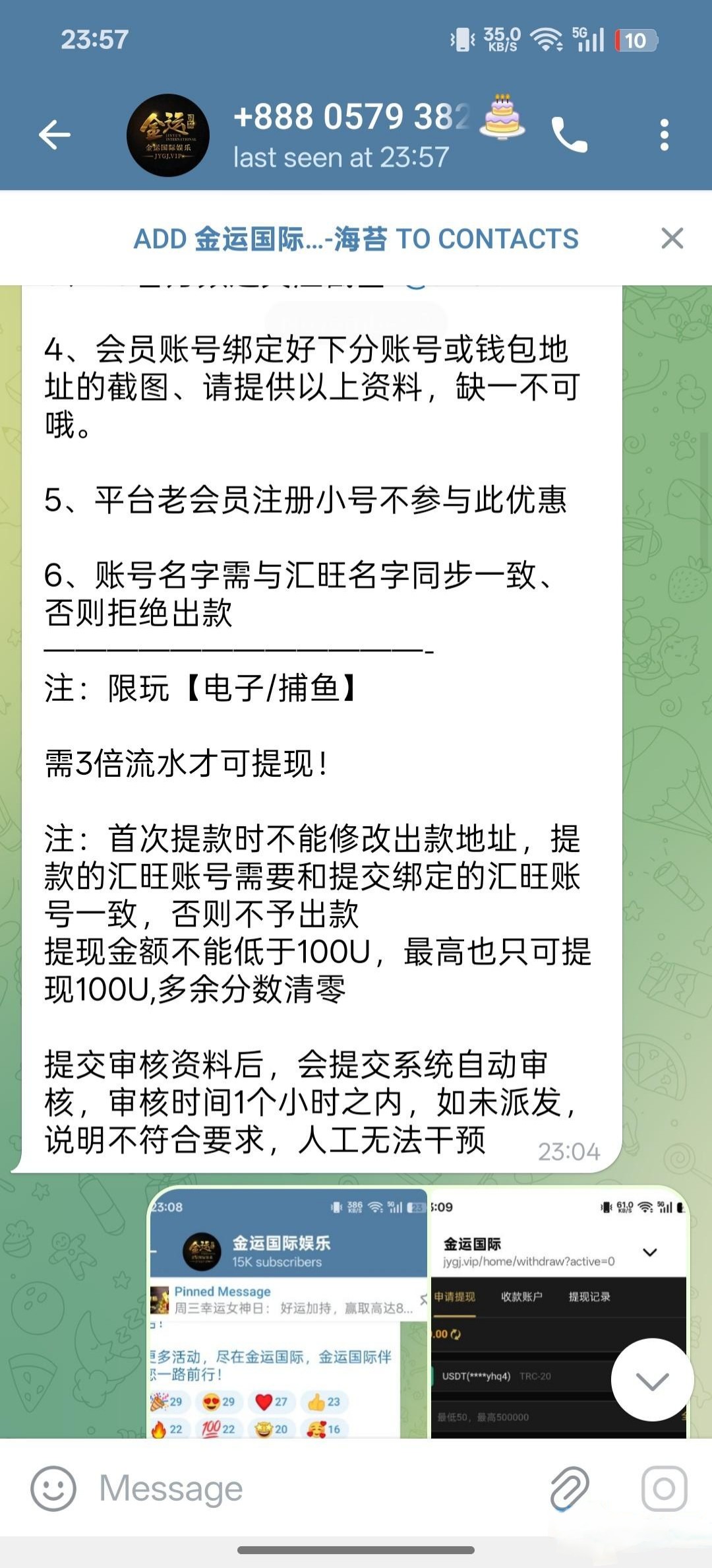 新用户联系飞机客服 @JYGJYLVIP 然后去频道链接注册,绑定流水多的u到账,可以绑定平台的充值地址,到时候p张图上分就好